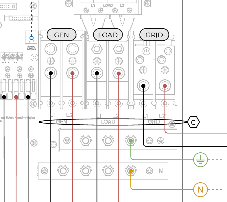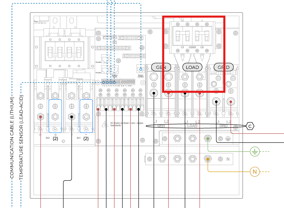 Verify that voltage between “GRID” L1 and “LOAD” L1 is 0V. Do the same for L2.