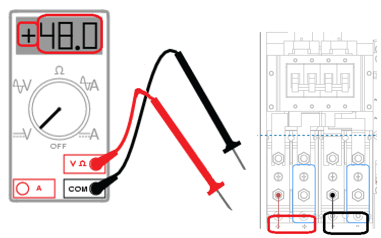 1. Turn ON internal switches of the batteries Check the voltage of the battery bank A. Voltage of the battery must be between 43VDC - 63VDC.