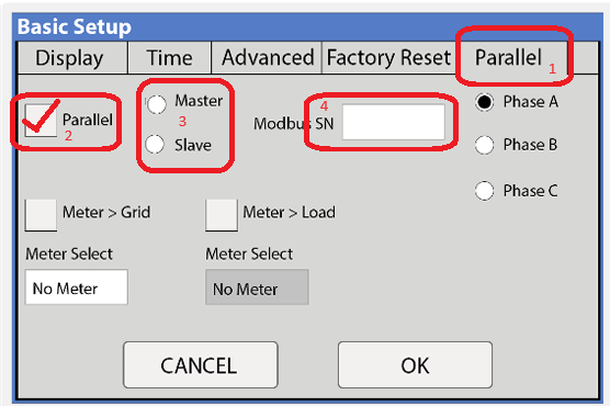 For multiple inverter installations, amperage values programmed into the inverter LCD screen are not cumulative. The only cumulative value is battery ampacity.