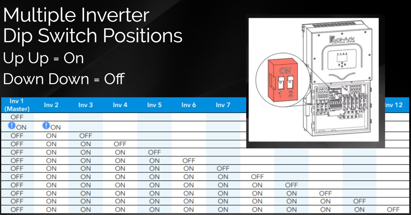 For single inverter installs, no adjustment is needed. Both switches should be down in the OFF position.