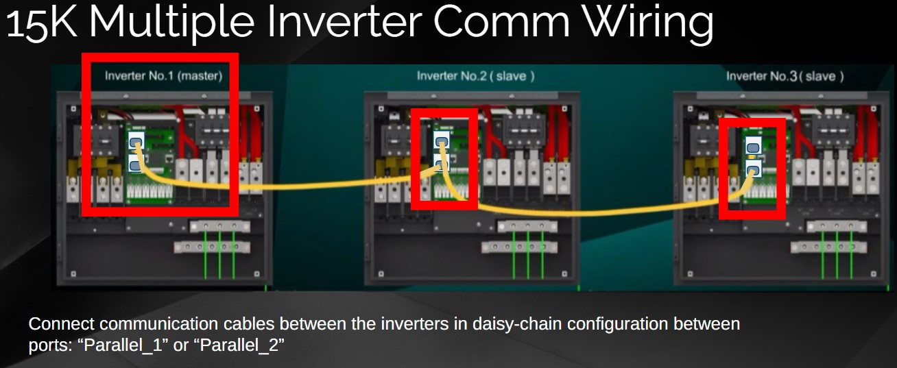 However, even though technically either port works, if you follow the displayed communication wiring arrangement, then it will be obvious if the inverter is wired a master inverter or a slave inverter.