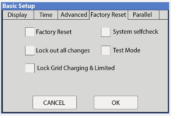 Batteries exceeded their current discharge limit. F41 Parallel_System_Stop_Fault If one system faults in parallel, this normal fault will register on the other units as they disconnect from the grid. F45 AC_UV_OverVolt_Fault Grid under voltage causes a disconnect. This will self-reset when the grid stabilizes.