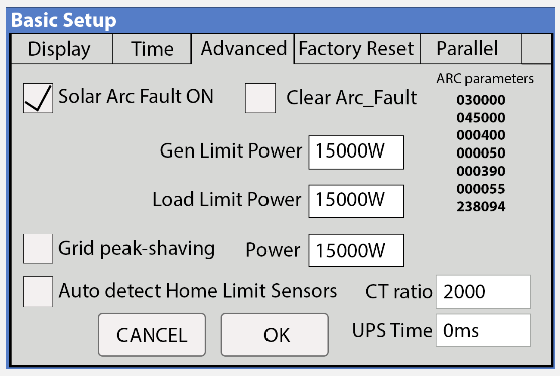 Solar Arc Fault ON: Enables Arc fault detection algorithm on the MPPTs.