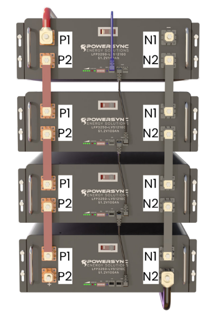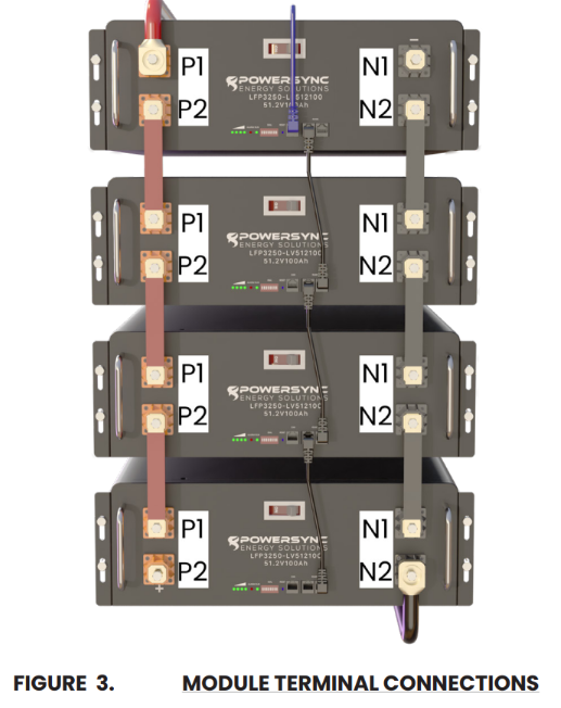 There are two positive and two negative terminal connectors on the module. A 400A busbar connects the positive and the negative terminals on the inside of each