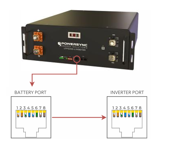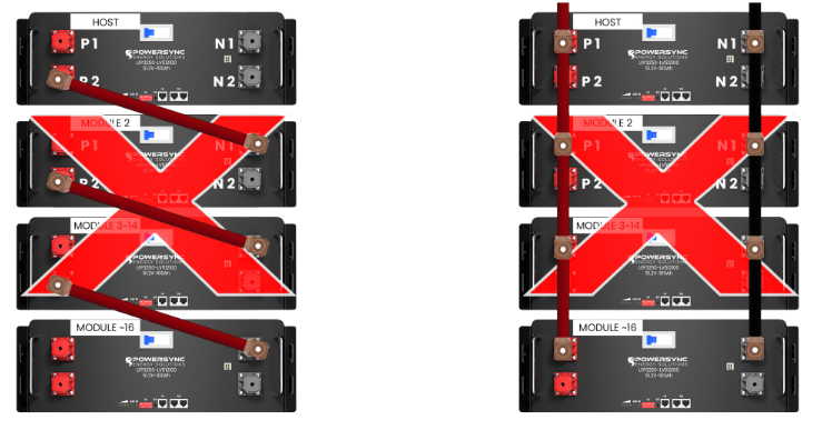 The can-bus port on the HOST battery shall be connected with the corresponding connection to the CAN bus on the PCS/inverter (blue cable). There are two RS485 connectors on each module for module to module connections. When connecting the communications cables they shall be connected as seen by the black cables drawing in Figure 3. Continue down the string with alternating port connections.